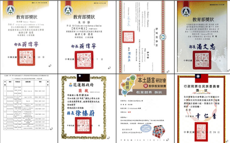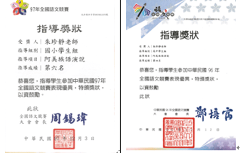 朱老師同時長期參與原住民族語言能力認證測驗命題與閱卷,並擔任教育部全國語文競賽及族語戲劇競賽評審委員,對族語專業人才培育與評量制度的建構貢獻良多。
